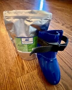 Place the boot on the sore hoof for about 15 minutes, repeat in 5-7 days if needed. In addition, we treat the affected hoof 2 or 3 times a day with Hoof’n Heal. The sick goat should improve in about a week or so of treatment. We also, do a SubQ injection of NuFlor antibiotic, 1cc per 20lbs, 2 doses 48 hours apart.