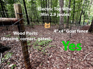 - 48″ 4″x4″ goat wire fence with electric top wire
